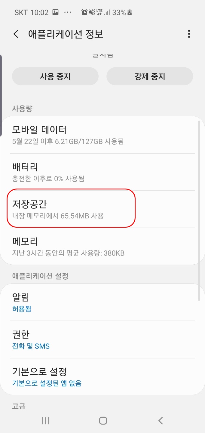 플레이 스토어의 애플리케이션정보 중 우리가 필요한 것은 저장공간에 저장된 파일들을 초기화 할 것이기 때문에