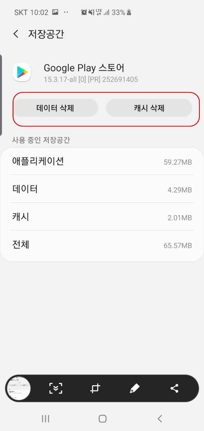 초기화 후에 업데이트를 시도하면 된다는 글을 보고 구글플레이 캐시와 데이터를 초기화 해보기로 하였습니다.