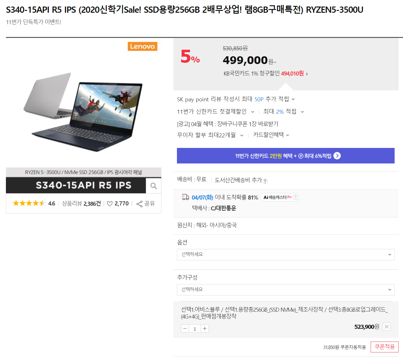 S340-15API R5 IPS (2020신학기Sale! SSD용량256GB 2배무상업! 램8GB구매특전) RYZEN5-3500U - 11번가