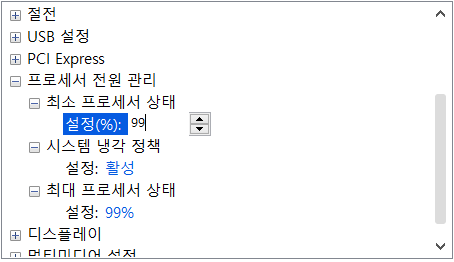 그렇기 때문에 최소 프로세스 상태와, 최대 프로세서 상태를 100%-> 99%로 설정합니다.
