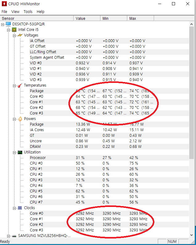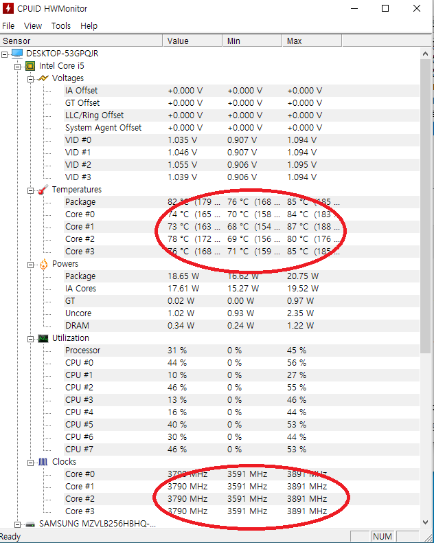 변경전에 3800MHz로 동작하고 발열이 아무것도 안해도 80도에 육박하였는데요. 재부팅후 측정한 결과는 아래와 같습니다.