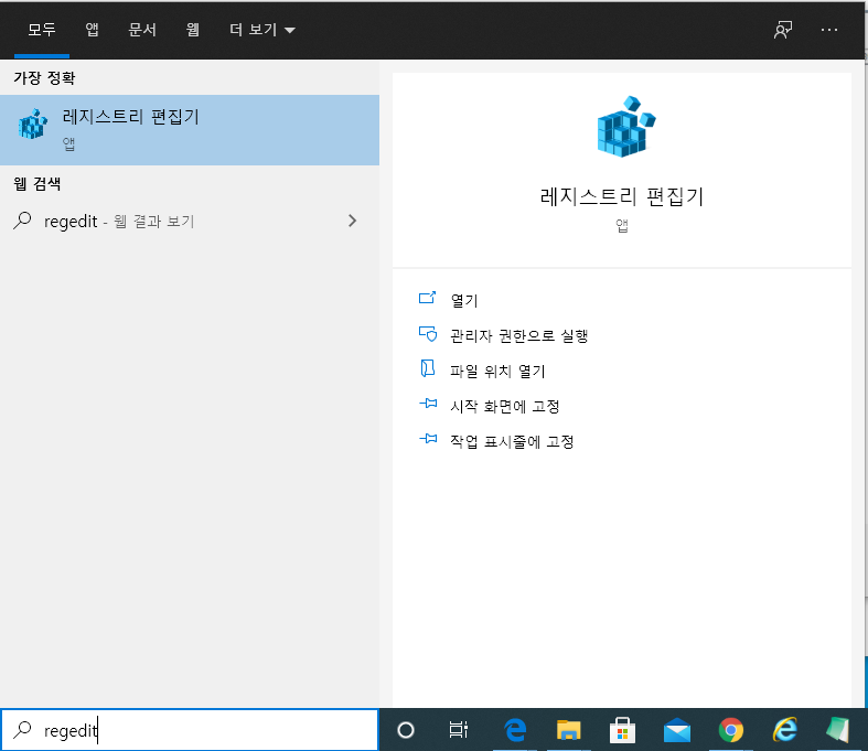 검색창에 Regedit을 입력하고 레지스트리 편집기를 실행합니다.