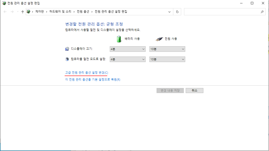 제어판에서 -> 하드웨어 및 소리 -> 전원 옵션 -> 전원 관리 옵션 설정 편집에 가서