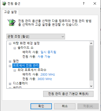 혹시 터보부스트를 지원하는 CPU는 하기 메뉴이외에 최대 프로세스 상태라는 메뉴가 있으면,