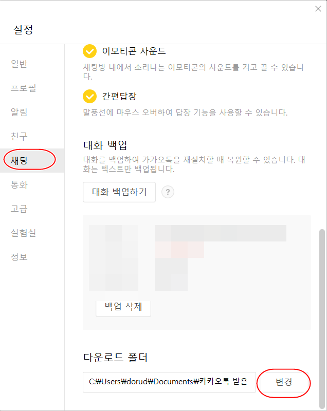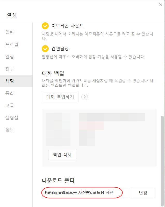 2. 설정 -> 채팅 -> 다운로드 폴더의 변경을 누릅니다.