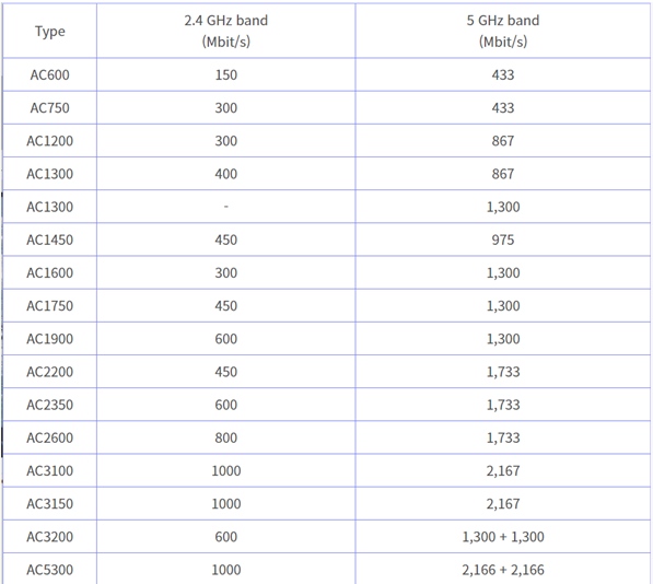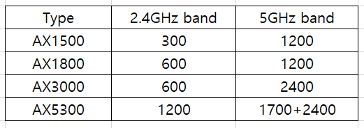 그리고 WiFi6에서는 AX로 불리우며 대표적인 모델들의 속도는 아래와 같습니다.