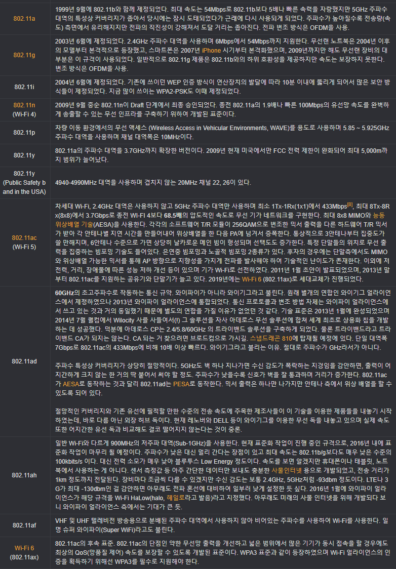 그리고 지속적으로 버전업하여, 현재 WiFi6까지 발전된 상태입니다.