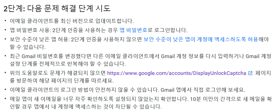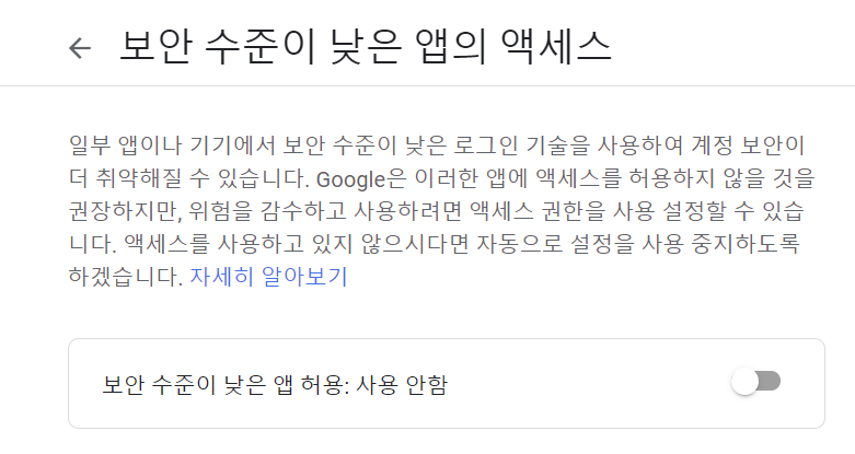아래링크에서 보안 수준이 낮은 앱의 액세스를 해제해주셔야 사용할수 있습니다.