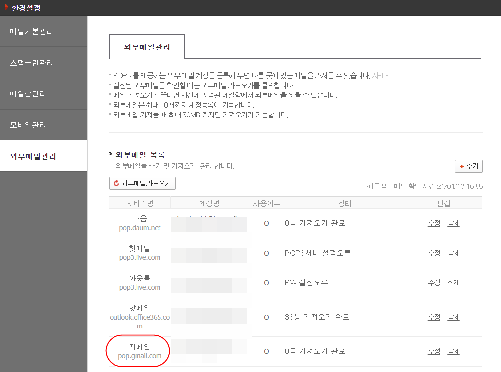 네이트에서는 외부 메일(다음, 네이버, 구글 등)을 가져와서 볼수 있는데요.