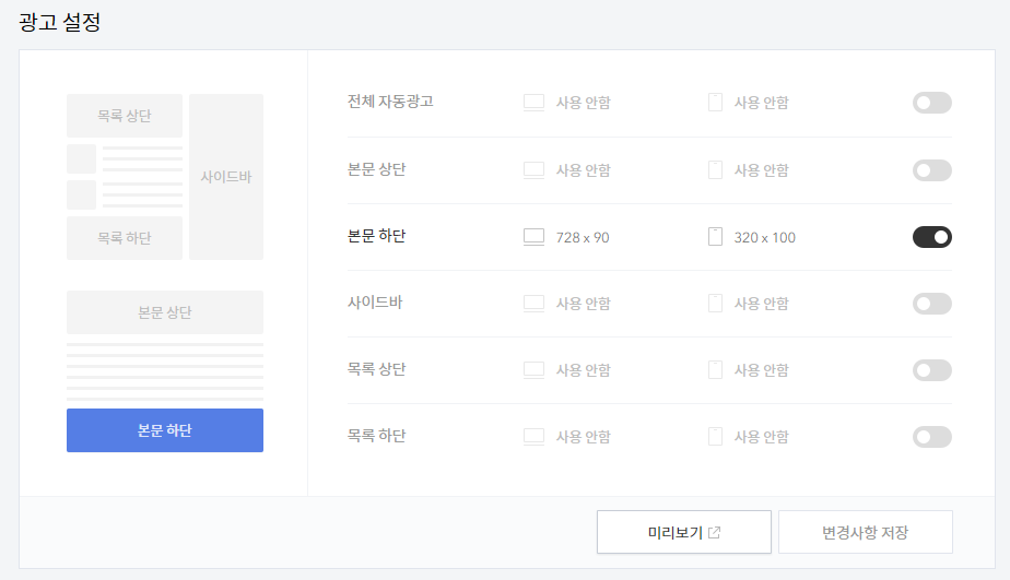 연동하고 전체 자동광고는 제외하고 본문하단 광고만 수동으로 넣어놓고 있습니다.
