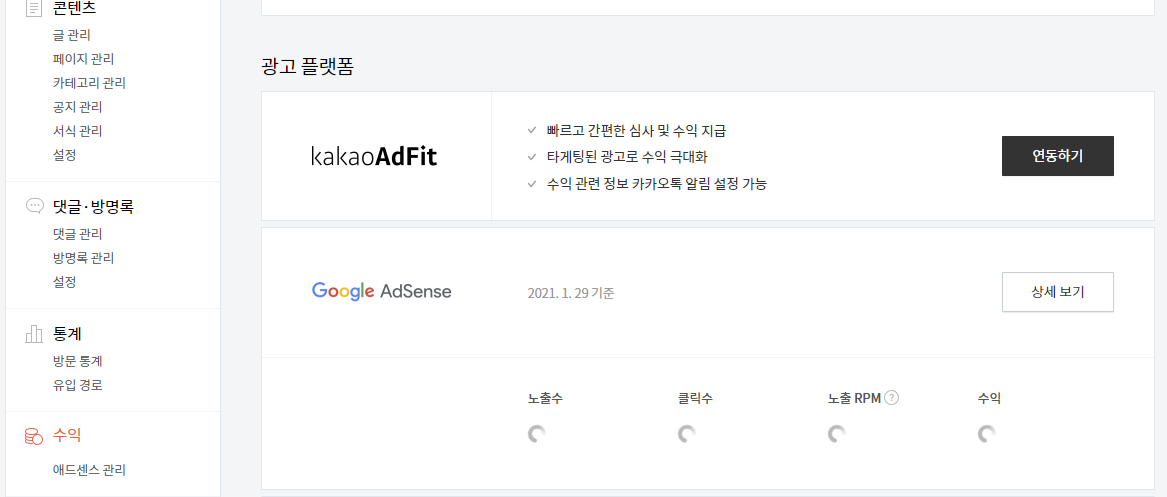 애드센스 계정만 연동하면 자동으로 수익이 연동됩니다.