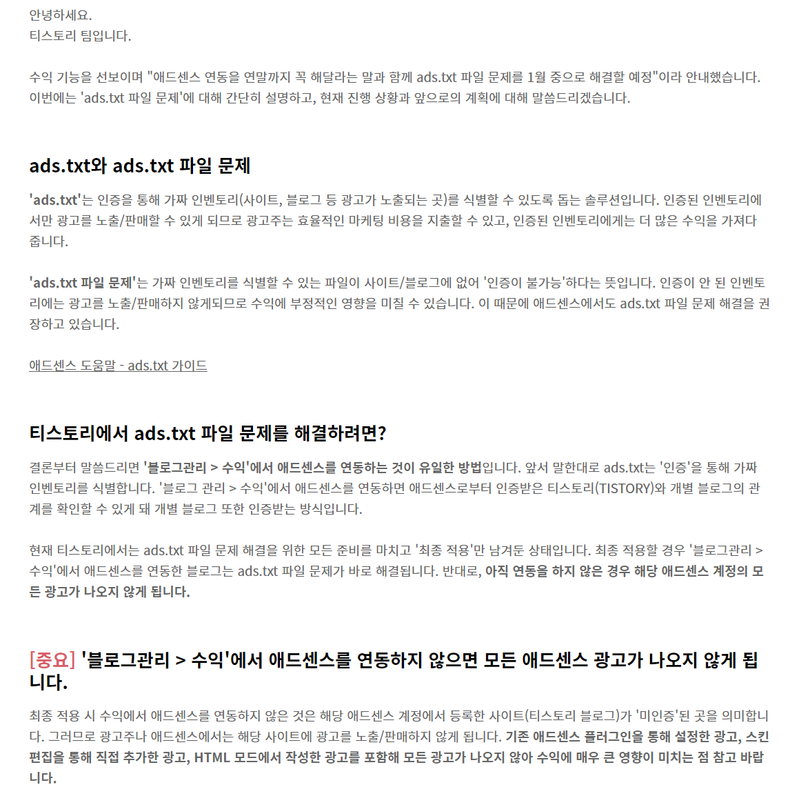 그리고 티스토리 공지를 보면 ads.txt 문제로 광고가 잘 안나올수 있으니 수익에서 연동을 하는 것을 권장하고 있습니다.