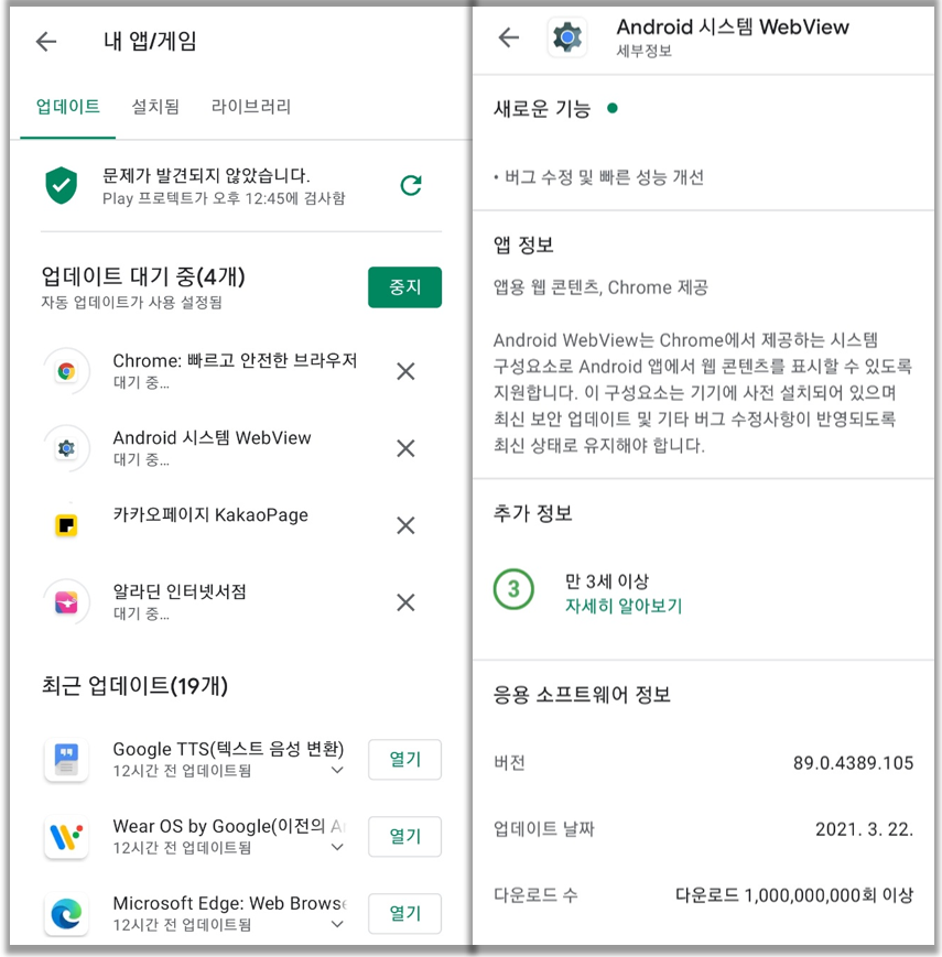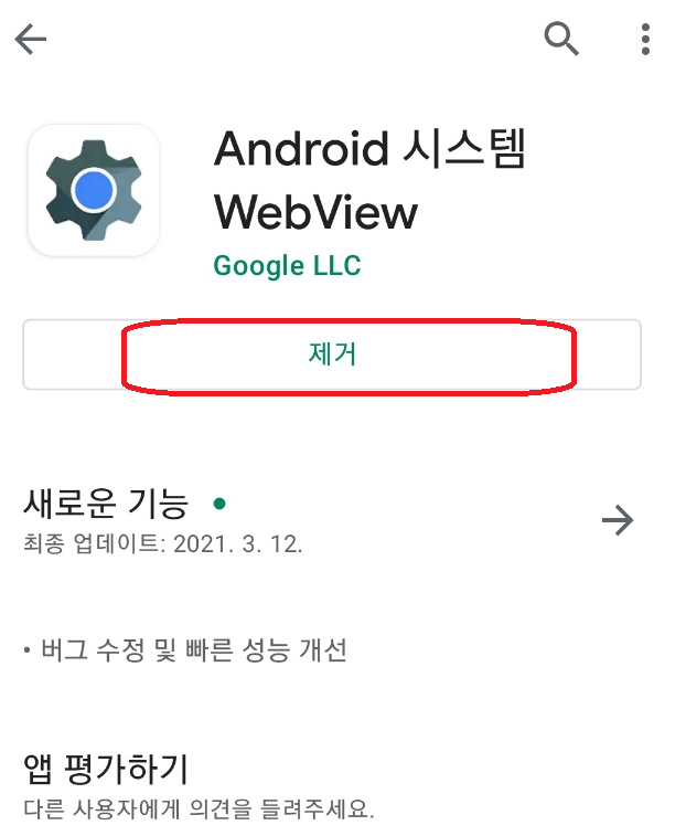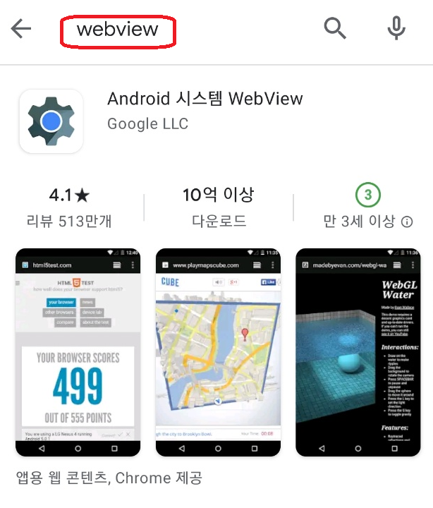 플레이스토어의 상단에 Webview라고 검색하신 후 Google LLC라고 개발사가 적힌 프로그램을 클릭하시고