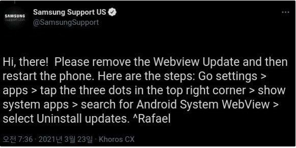 관련하여 여러 프로그램 개발자 및 앱 개발사에서는 Webview Update를 삭제하라고 권고하고 있습니다.