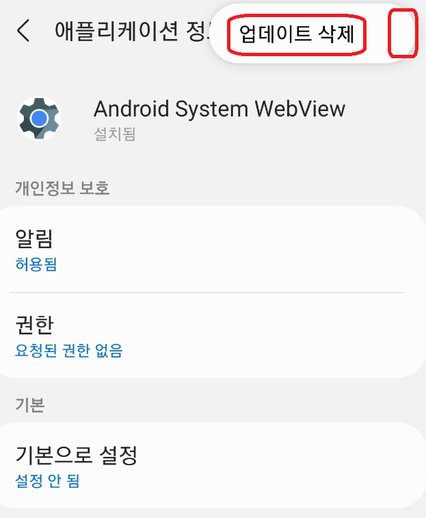 애플리케이션 정보에서 상단의 점점점을 누르시고, 업데이트 삭제를 누르시면 업데이트를 삭제 하실 수 있습니다.