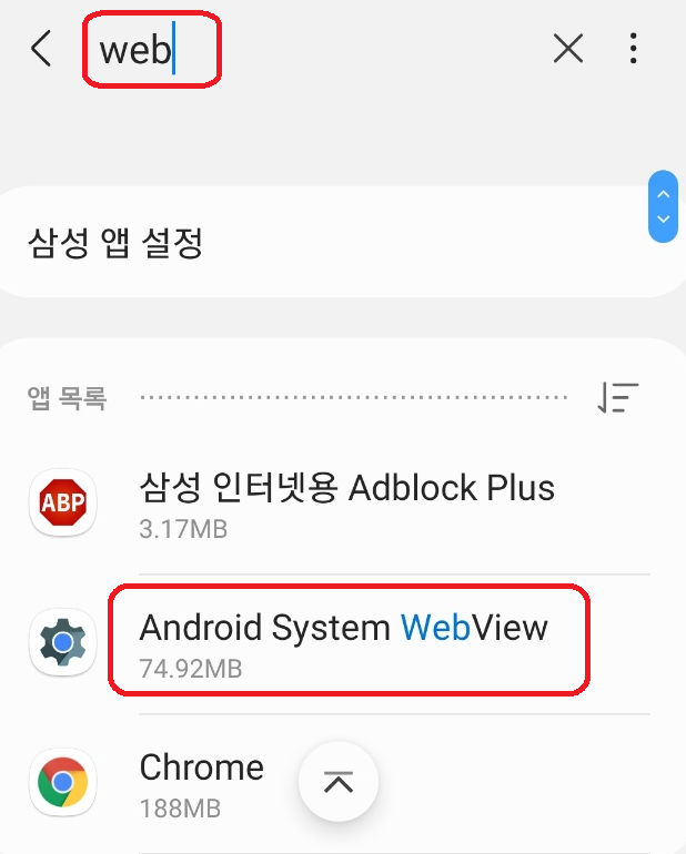 Android System Webview가 검색됩니다. 약 74메가의 이 앱을 클릭해 줍니다.