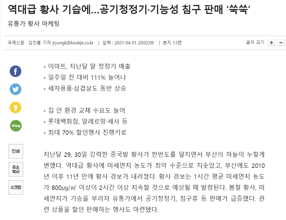 찾아보니 저만 그런게 아니라 역대급 황사로 공기청정기 및 기능성 침구가 엄청 팔렸다고 합니다.