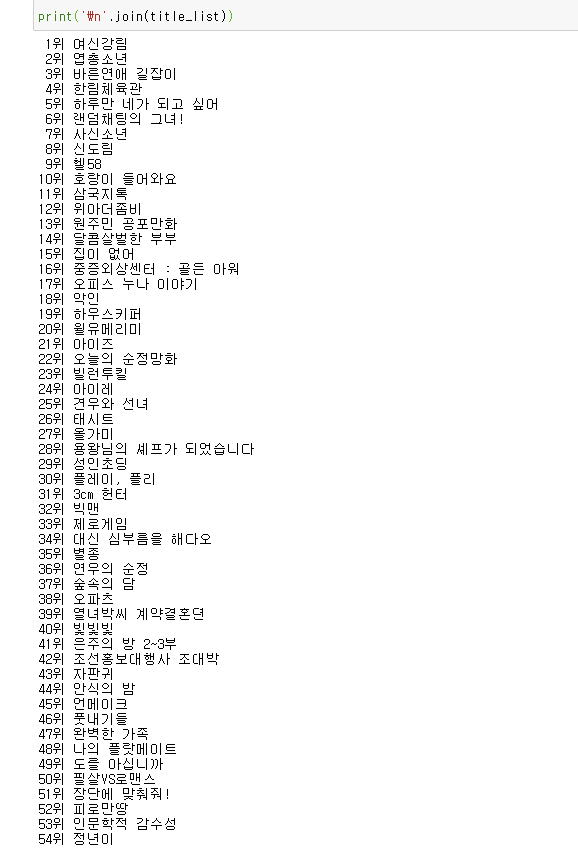 for a in raw_title_list: #타이틀 전체를 불러와서 정렬