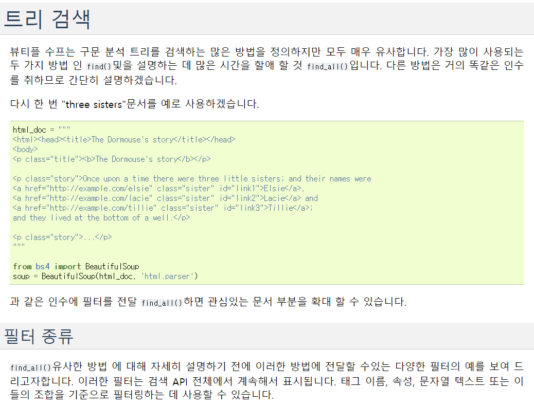 Document를 통해서 find_all 또는 select를 통해서 원하는 내용을 선택할 수 있습니다.