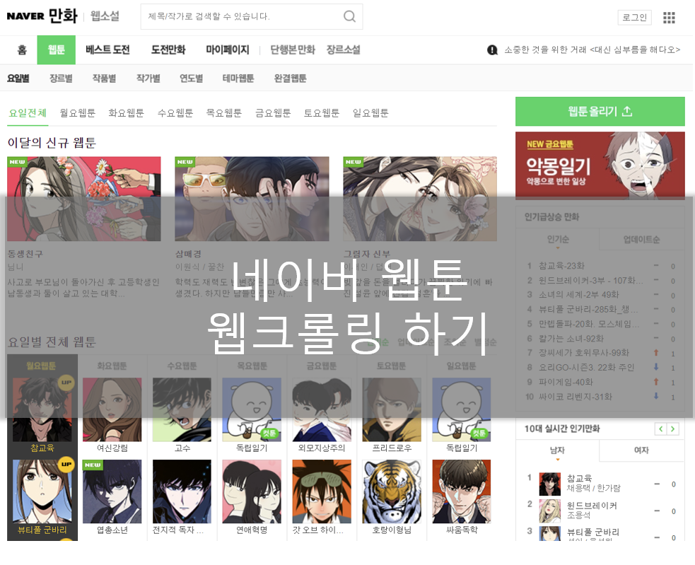 안녕하세요. 오늘은 파이썬을 활용해서 네이버 웹툰 사이트를 웹크롤링 하는 방법을 알아보겠습니다.