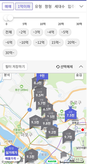 대표적인 부동산 어플인 호갱노노에서 매매1억은 단위에도 없지만 굳이 어렵게 터치해서 찾아보면