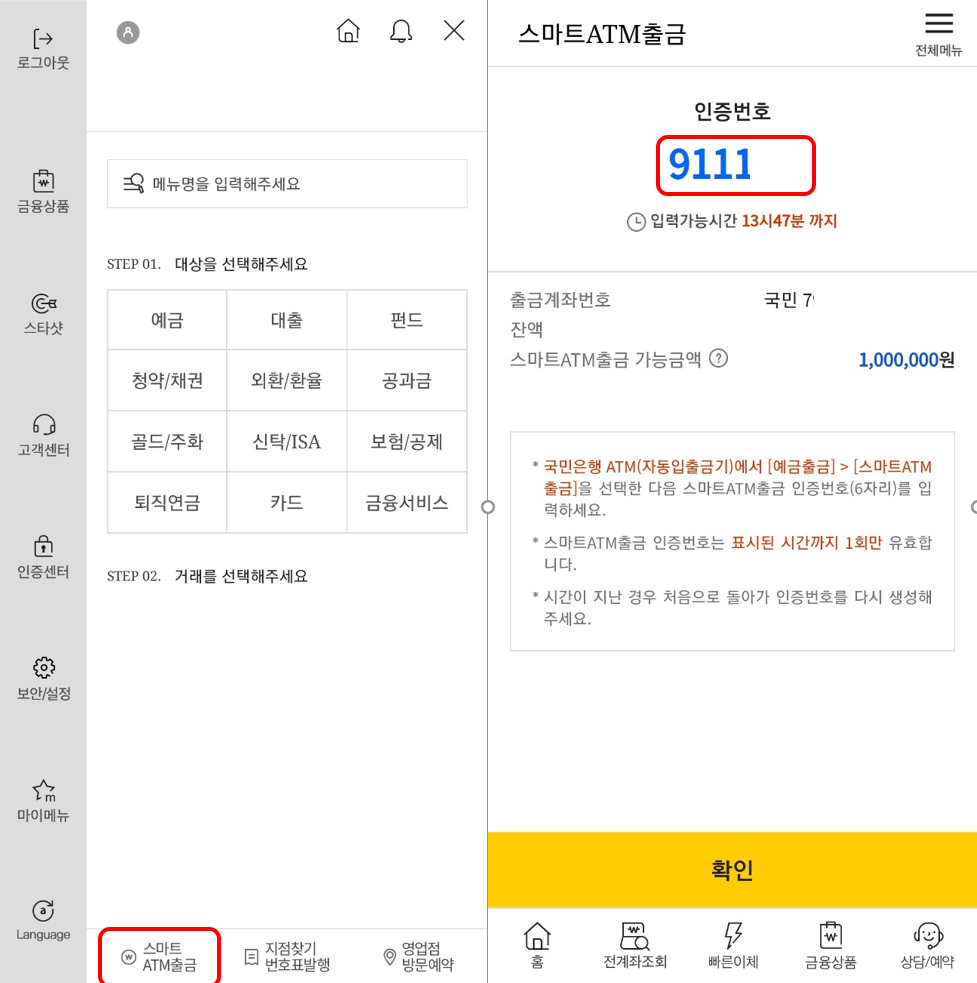 KB스타뱅킹 어플에서 예금 -> 출금 -> 스마트 ATM 출금을 클릭하시면 ATM 출금 인증번호가 생성됩니다.