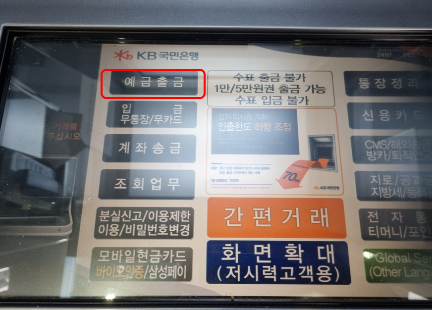 먼저 가까운 ATM기에 가셔서 예금 출금을 클릭합니다.