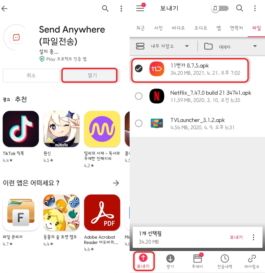 파일에서 해당 폴더 Backup/apps로 이동하신뒤 원하시는 파일을 체크하시고 하단의 보내기를 누릅니다.