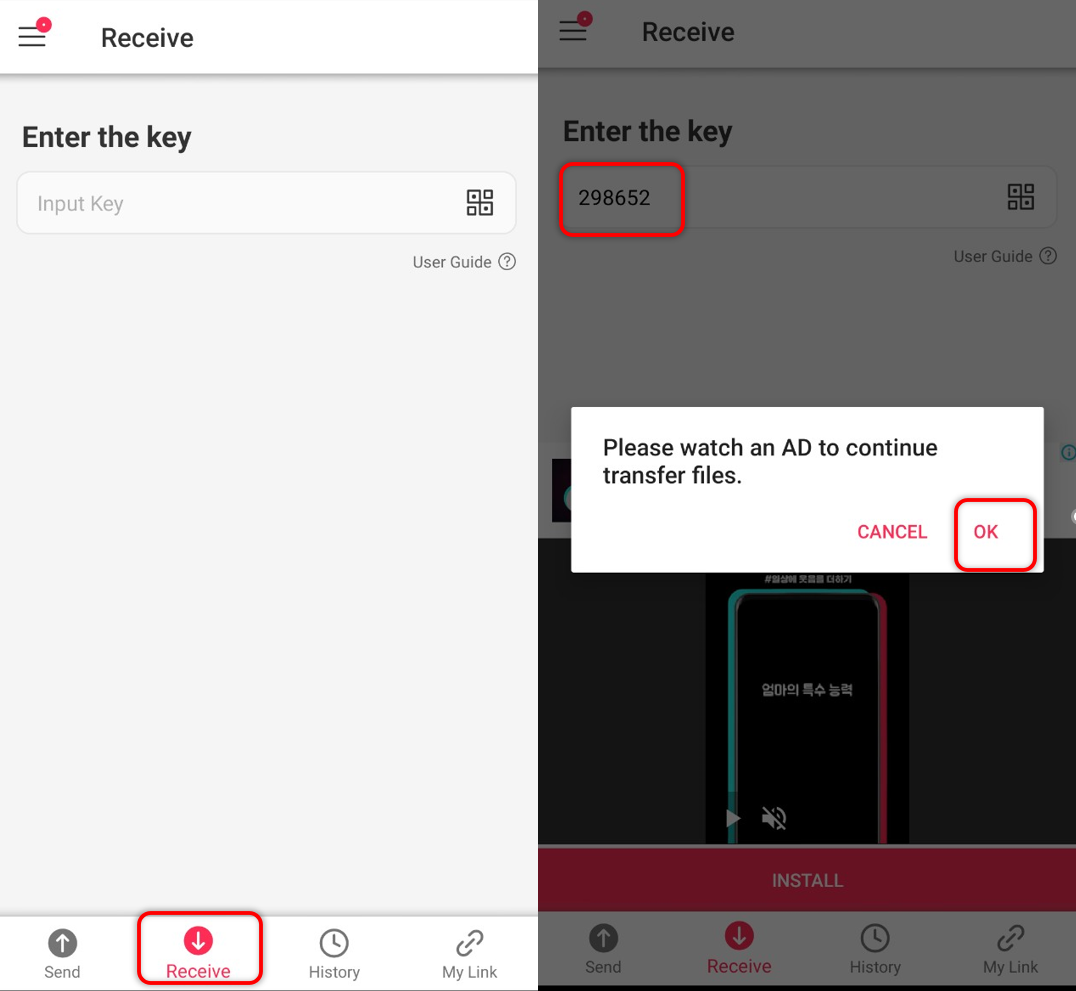 저는 이 핸드폰이 영어로 설정되어있네요. 하단에 받기를 누르시고 위의 코드를 입력해주시면 됩니다.