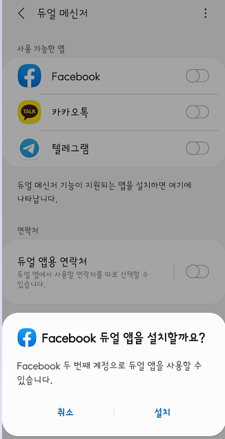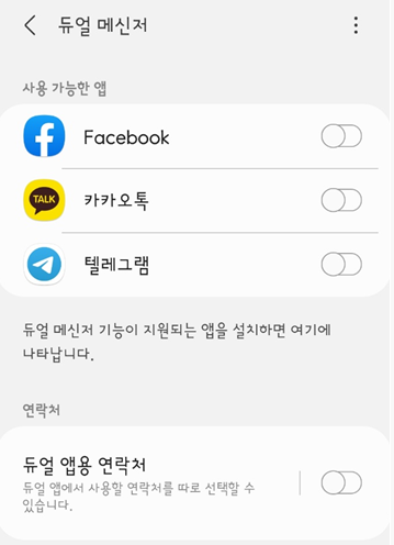 이렇게 하면 갤럭시에서 듀얼메신저를 지원하는 3개의 앱 페이스북/카카오톡/텔레그램은 활성화만 하면 바로