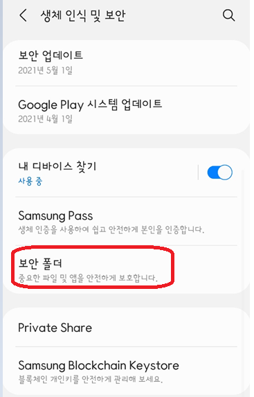 설정 -> 생체 인식 및 보안 -> 보안폴더로 진입합니다.