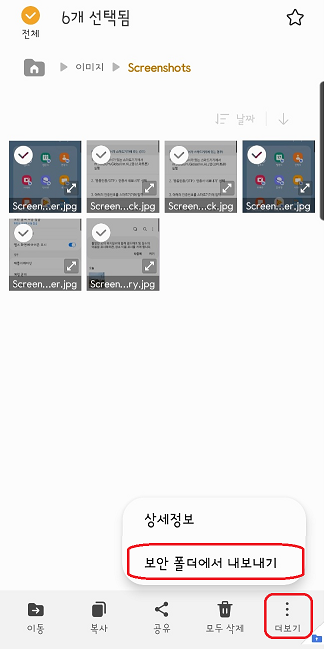 하단에 위치한 더보기를 눌러서 보안폴더에서 내보내기를 누르셔야 합니다.