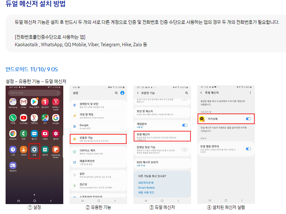 듀얼메신저는 갤럭시에서 기본적으로 지원하는 기능으로 좀더 손쉽게 설정이 가능합니다.