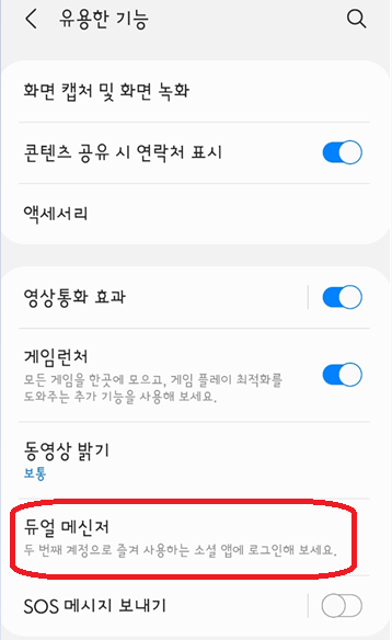 먼저 설정 -> 유용한 기능 -> 듀얼메신저로 들어갑니다.