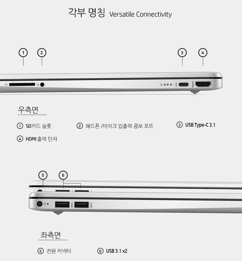 포트는 USB A포트 2개와 USC-C포트 1개, 헤드폰, HDMI포트, SD카드 슬롯이 있습니다.