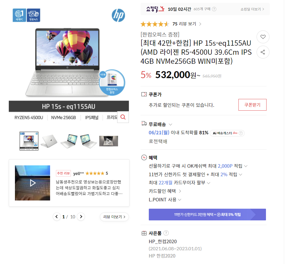 라이젠 4500u/4G RAM/256G NVME SSD/15인치 IPS 250 nit/ 1.69KG이 스펙인데요.