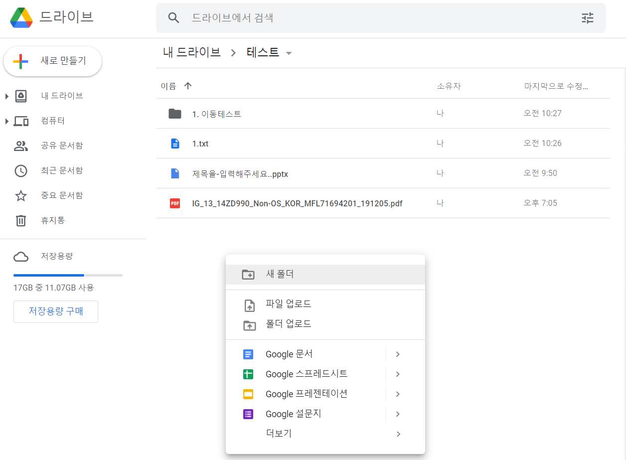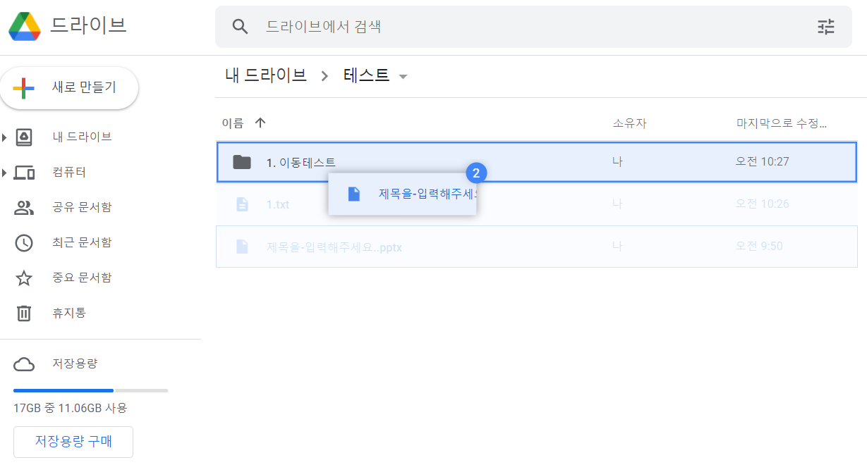 구글 드라이브에서 파일의 이동과 삭제는 탐색기와 유사한데요.