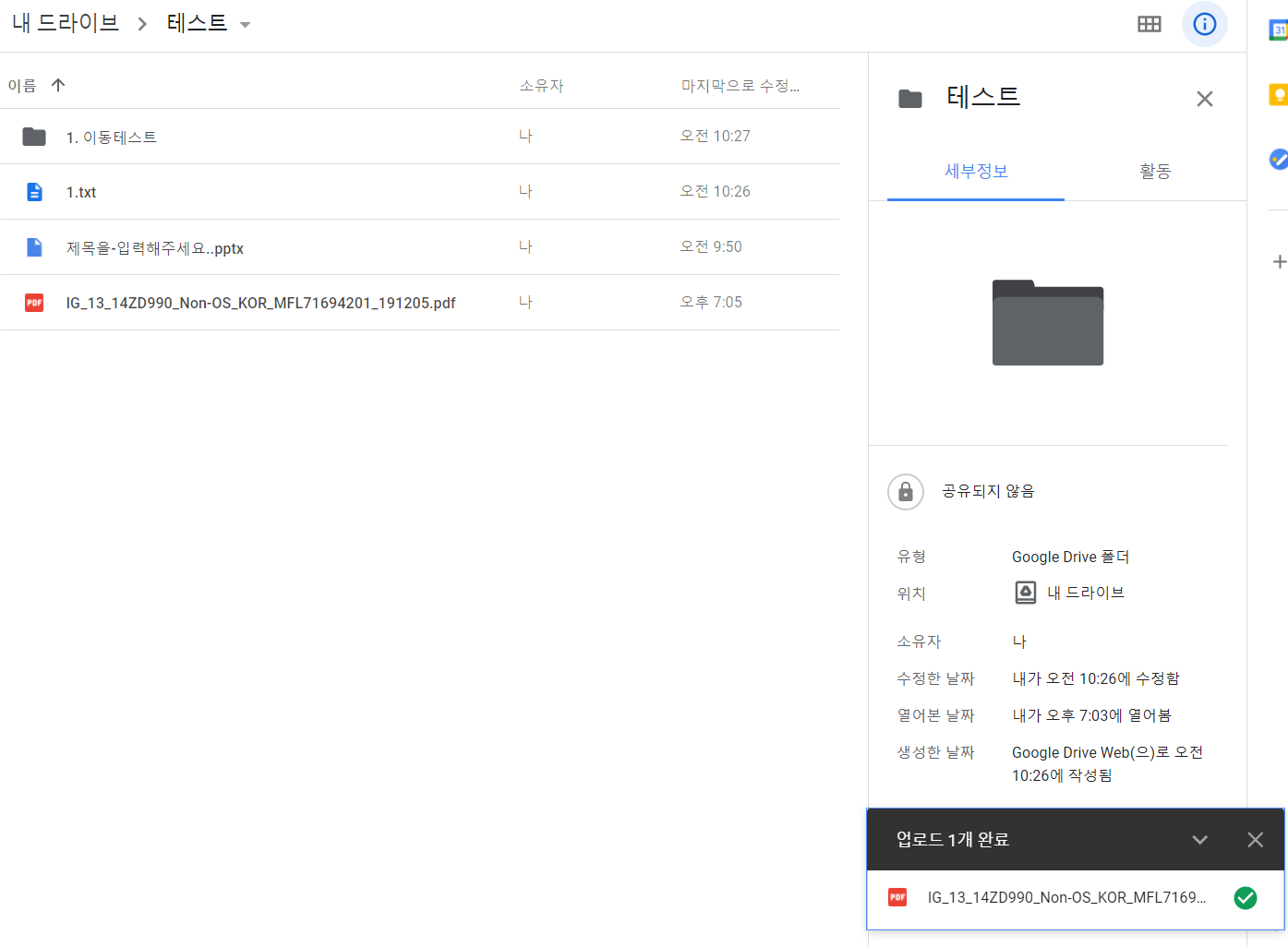 그리고 파일을 업로드하면 우측하단에 진행상황을 확인할 수 있습니다.
