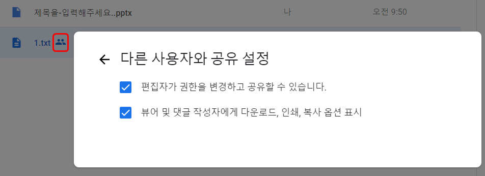 공유를 설정하면 파일 옆에 공유아이콘이 추가되어 공유되지 않은파일과 구별할 수 있구요.