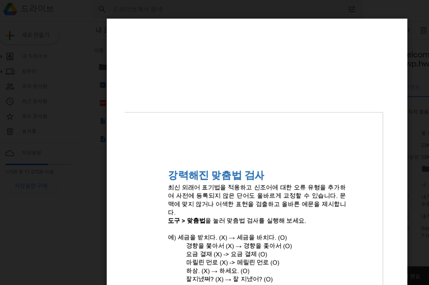 우측이 네이버 mybox에서 한글파일을 열어본 것인데요. 구글에서는 일부 레이아웃이 깨진 부분도 있습니다.