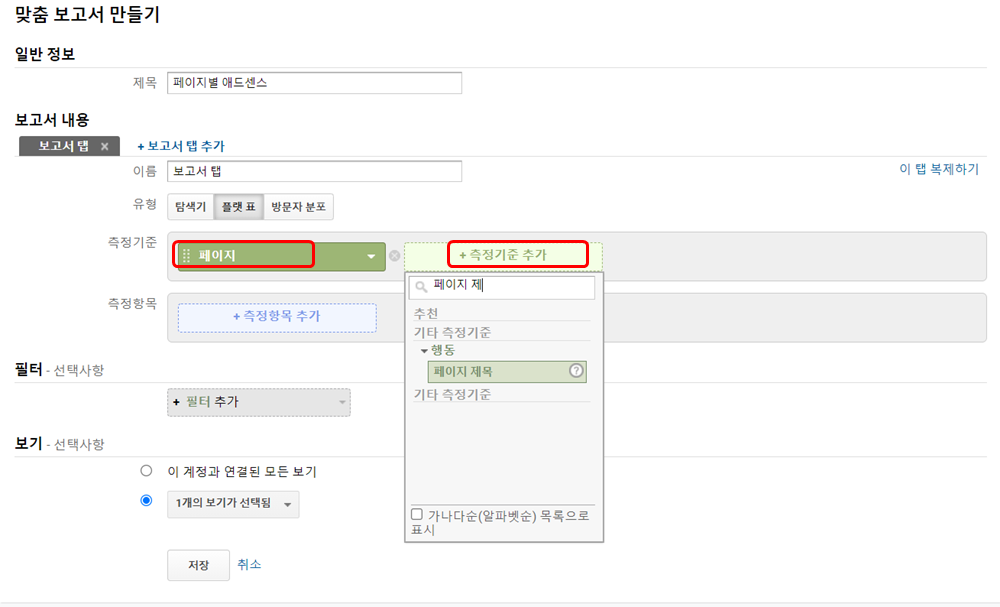 측정기준은 페이지, 페이지 제목을 추가해줍니다.