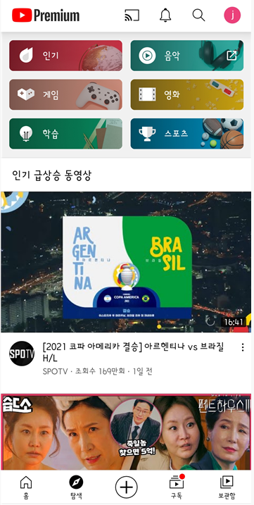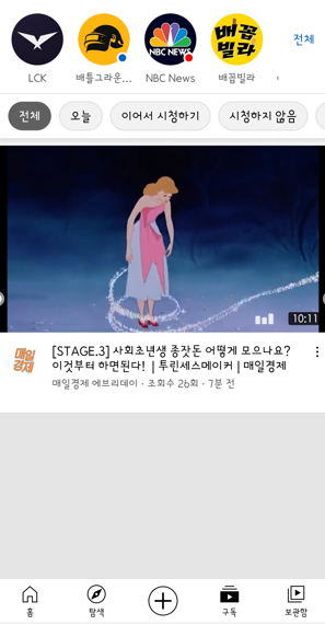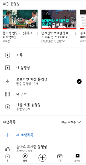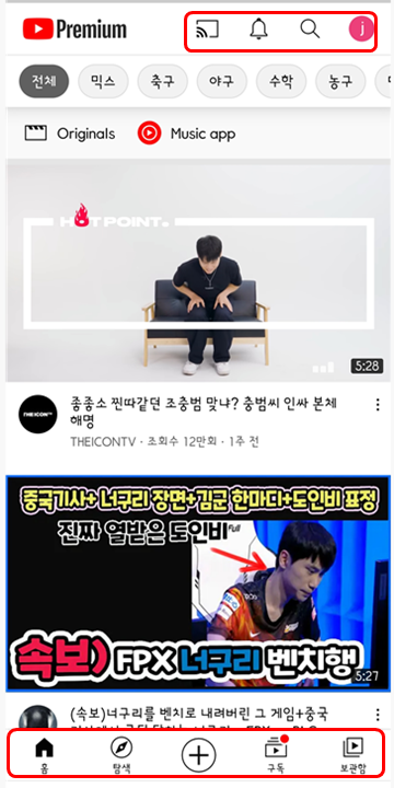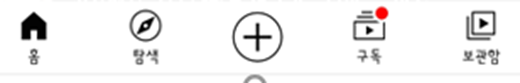 그리고 구독한 영상을 모아서 볼 수 있는 구독, 그리고 저장을 눌러서 보관해놓은 영상을 보는 보관함으로 구성되어 있습니다.