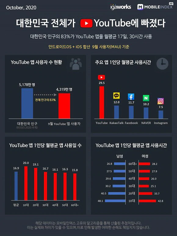 국내 통계를 살펴보면 대한민국 전체 인구의 83%가 유튜브를 사용하고 있습니다.