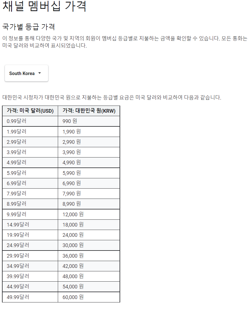 채널 멤버십은 아래와 같으며, 최소 990원부터 6만 원의 멤버십 회원을 모집할 수 있습니다.