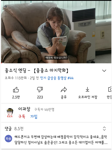 요즘 보는 좋좋소 영상인데요. 영상 하단에 순서대로 좋아요, 싫어요 , 공유, 오프라인 저장, 저장 메뉴가 있습니다.