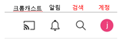 상단 메뉴부터 살펴보면 크롬캐스트, 알림, 검색, 계정의 순서인데요.