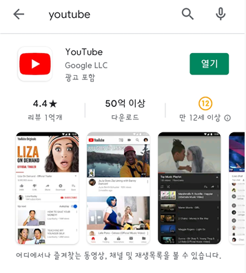 상단바에서 검색하시거나, Play 스토어에서 Youtube를 찾으셔서 열기를 누르시면 됩니다.