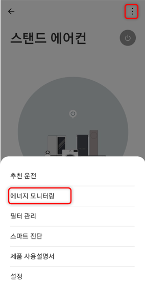 에어컨을 선택하시고 상단의 점점점을 누르신 뒤 에너지 모니터링을 누르시면 됩니다.
