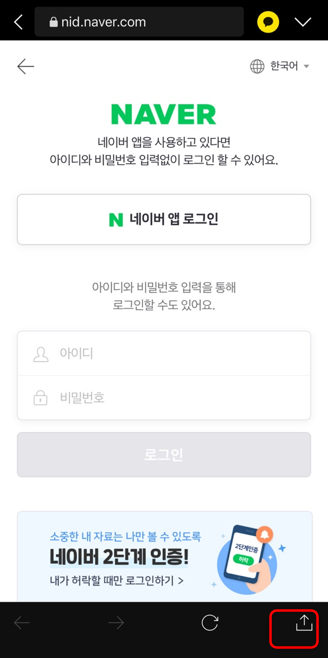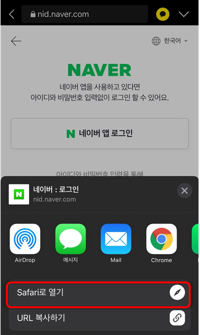 이 방법은 네이버 앱으로 열기는 안되지만 아이폰의 기본 브라우저인 사파리로 간편하게 열 수 있습니다.