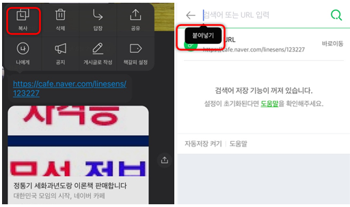 - 네이버, 사파리 등의 다른 브라우저 앱에서 주소 칸에서 꾹 눌러서 붙여넣기 한 후 이동